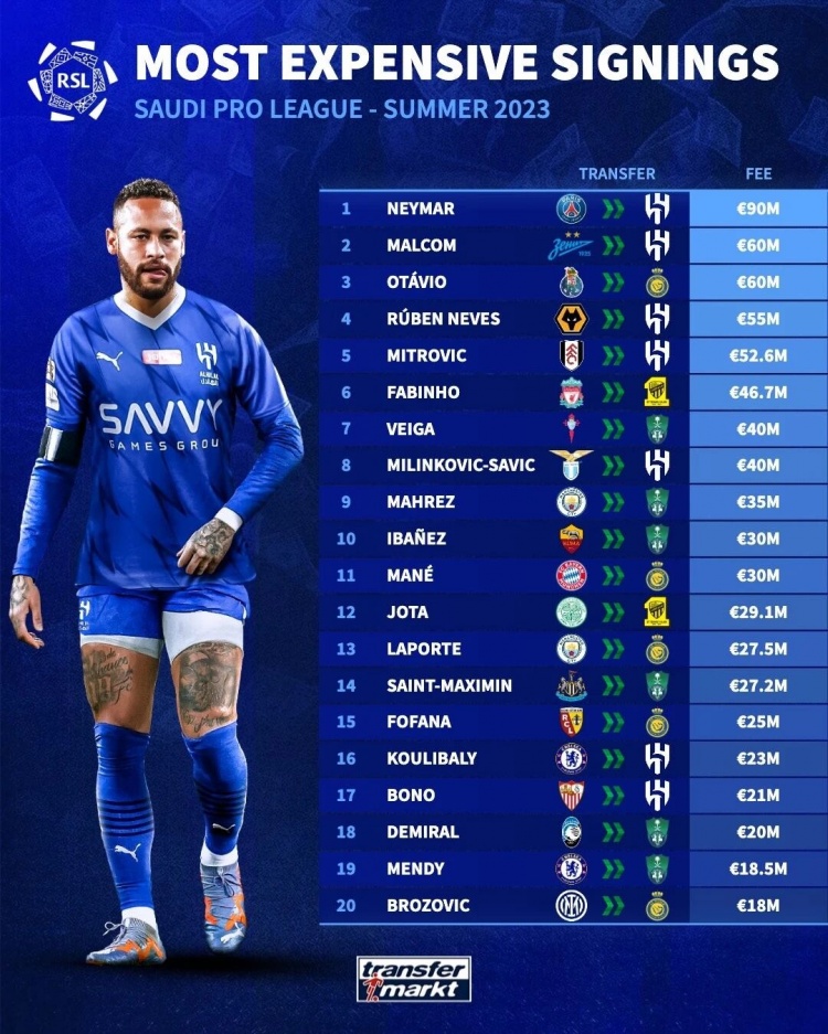 小因扎吉麾下新增穆罕默德·梅特、布瓦布雷、穆拉德·豪萨维、苏丹·马达什、巴勃罗·马里和本泽马等7位强援,他们转会费总和达到了近7000万欧元。利雅得胜利只花费了63万欧元,引进了名不见经传的海德尔·阿卜杜勒卡里姆和阿卜杜拉·哈姆丹。吉达国民花费1000万欧元,收获的唯一新援是巴西年轻前锋里卡多·马蒂亚斯。吉达联合则是在本泽马和坎特离队后被动出手,签下了恩内斯里和伊莱尼赫纳。