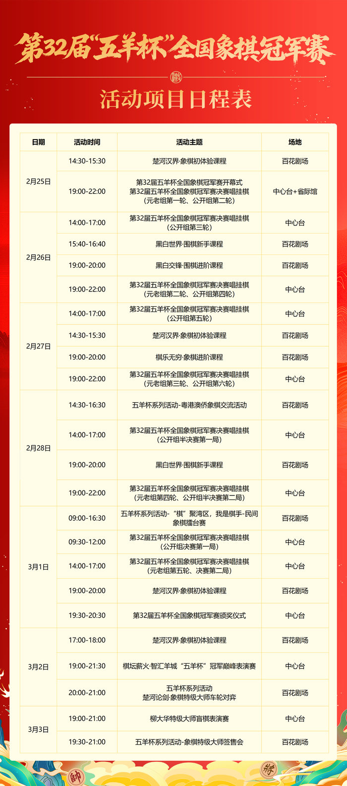 2月25日至3月2日决赛期间,本届“五羊杯”还创新推出“棋聚羊城・非遗寻味”嘉年华活动,将象棋赛事与文旅体验深度融合。在广州文化公园内设置棋文化体验、非遗餐饮、非遗手作等多个功能区,引入老字号美食、智能棋艺机器人、传统技艺互动等内容,打造“可看、可玩、可品、可购”的沉浸式场景。